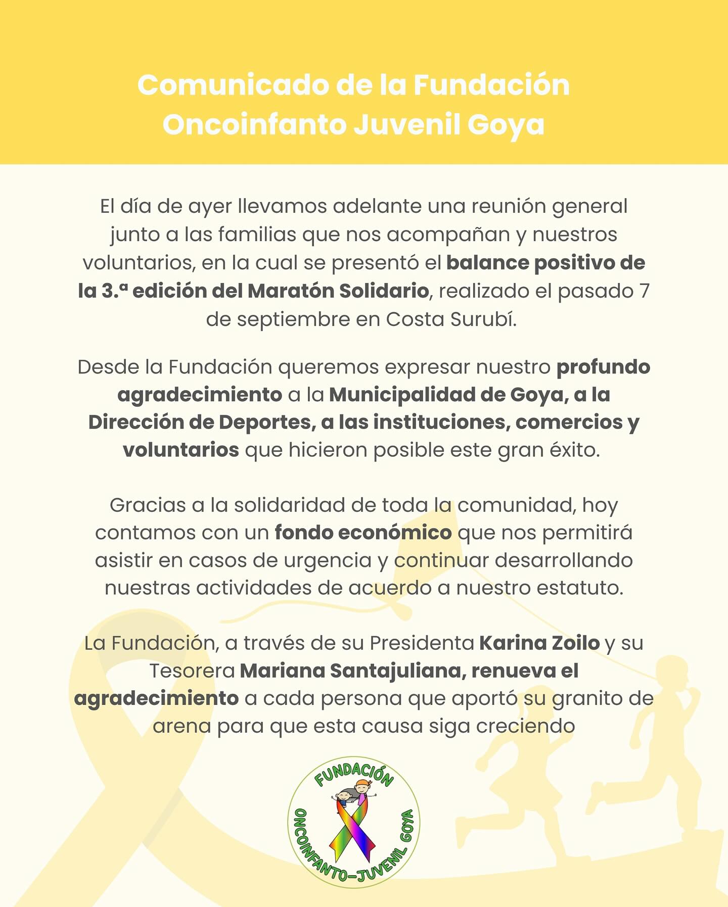 Tras la reunión, la Fundación Onco Infanto Juvenil Goya expresa su profundo agradecimiento a la Municipalidad de Goya, a la Dirección de Deportes, a las instituciones, comercios y voluntarios que hicieron posible este éxito.