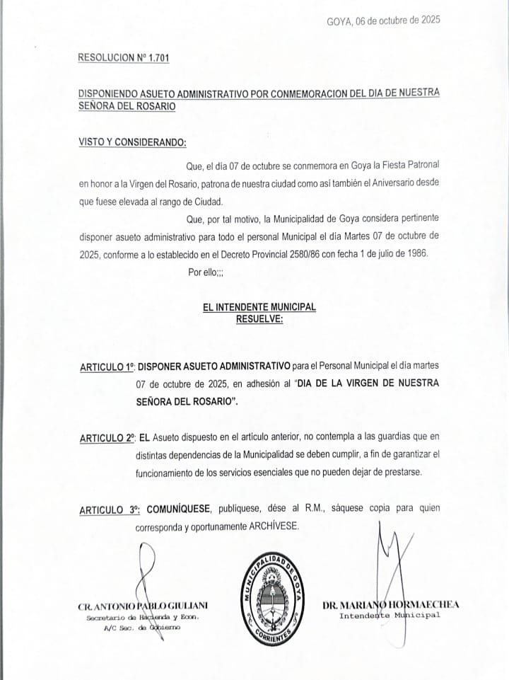 Que, por tal motivo, la Municipalidad de Goya considera pertinente disponer asueto administrativo para todo el personal Municipal el día Martes 07 de octubre de 2025, conforme a lo establecido en el Decreto Provincial 2580/86 con fecha 1 de julio de 1986.