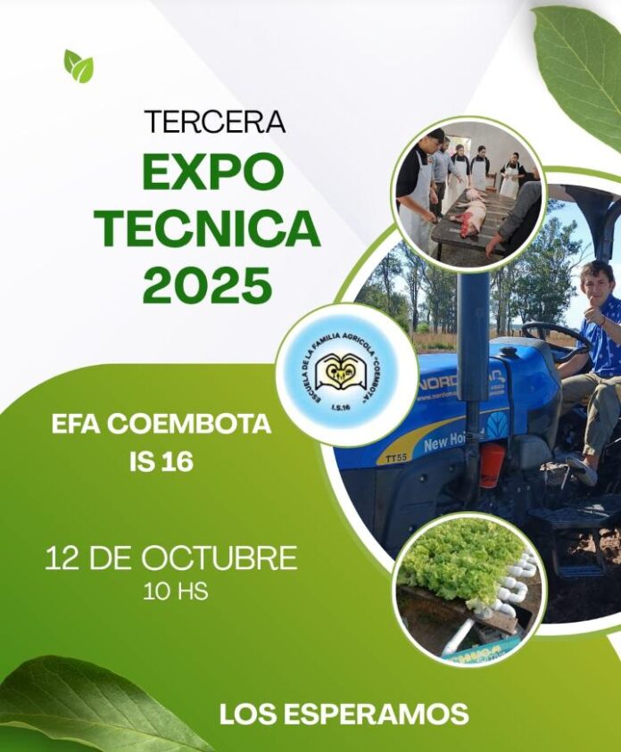 El equipo de coordinadores de la Escuela de la Familia Agrícola, EFA COEMBOTA, invita para este domingo 12 de octubre a vivir la experiencia de la 3ª Jornada Expo Técnica. Se podrá conocer el trabajo de investigación de los alumnos y venta de productos de esa comunidad educativa rural. El evento iniciará a las 10 de la mañana.