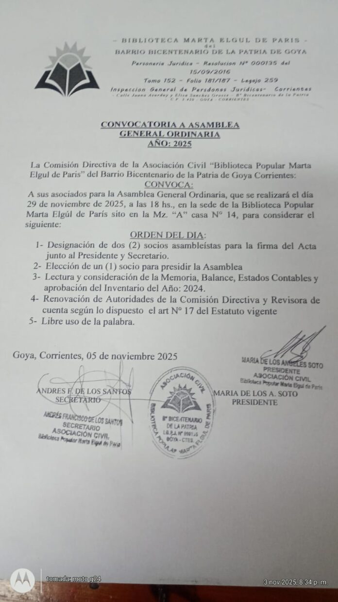 A sus asociados para la Asamblea General Ordinaria, que se realizará el día 29 de noviembre de 2025, a las 18 hs., en la sede de la Biblioteca Popular Marta Elgúl de París sito en la Mz. “A” casa N° 14, para considerar el siguiente: