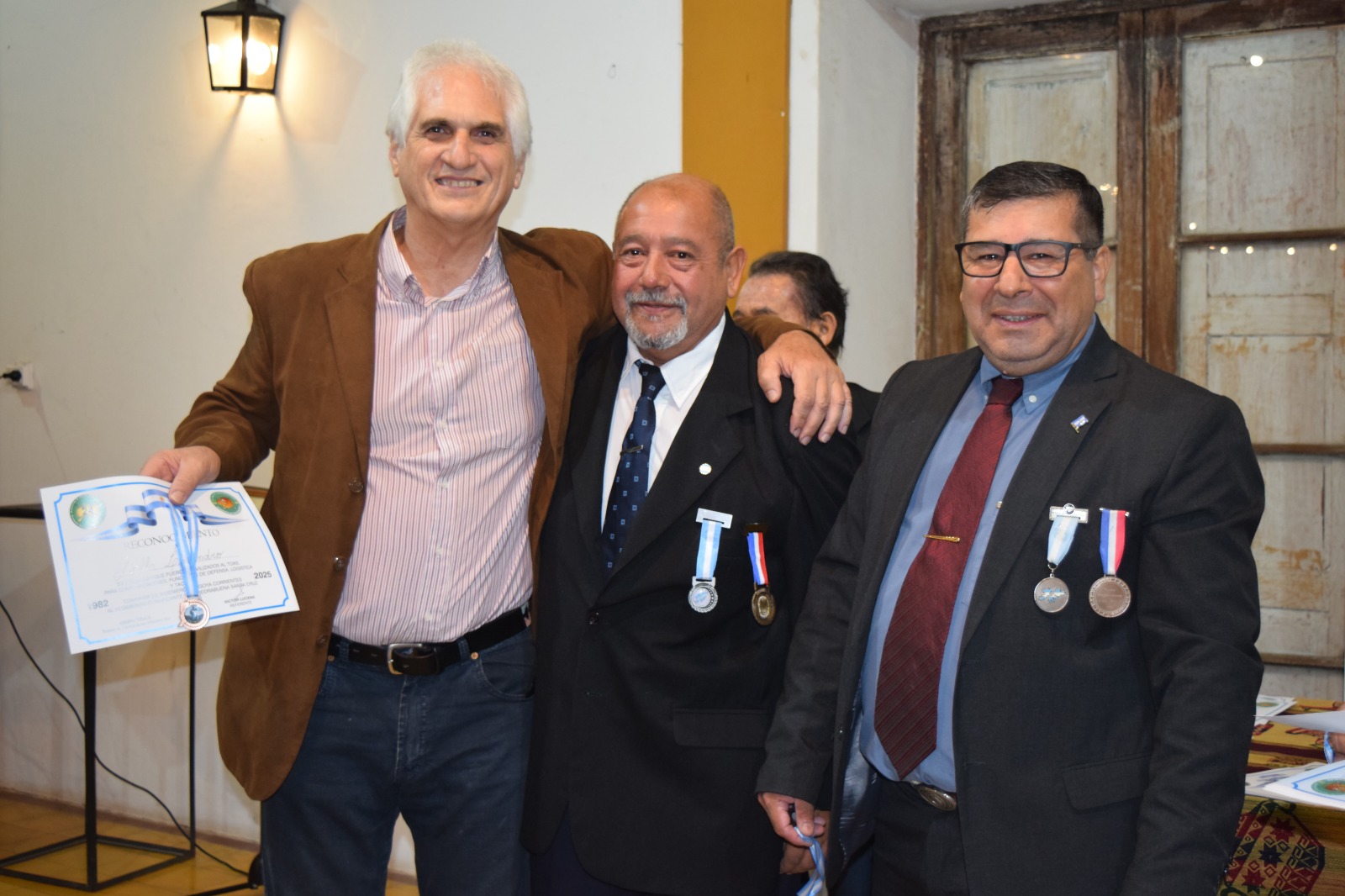 Seguidamente se procedió a reconocer a los ex soldados de nuestra ciudad, iniciando esa ceremonia la entrega de una plaqueta y medalla al actual Coronel Dr. Hugo Leyes, que al terminar su carrera universitaria de odontología prestó el servicio militar junto a esos ex soldados, para continuar con la misma modalidad al resto de los ex soldados presentes.