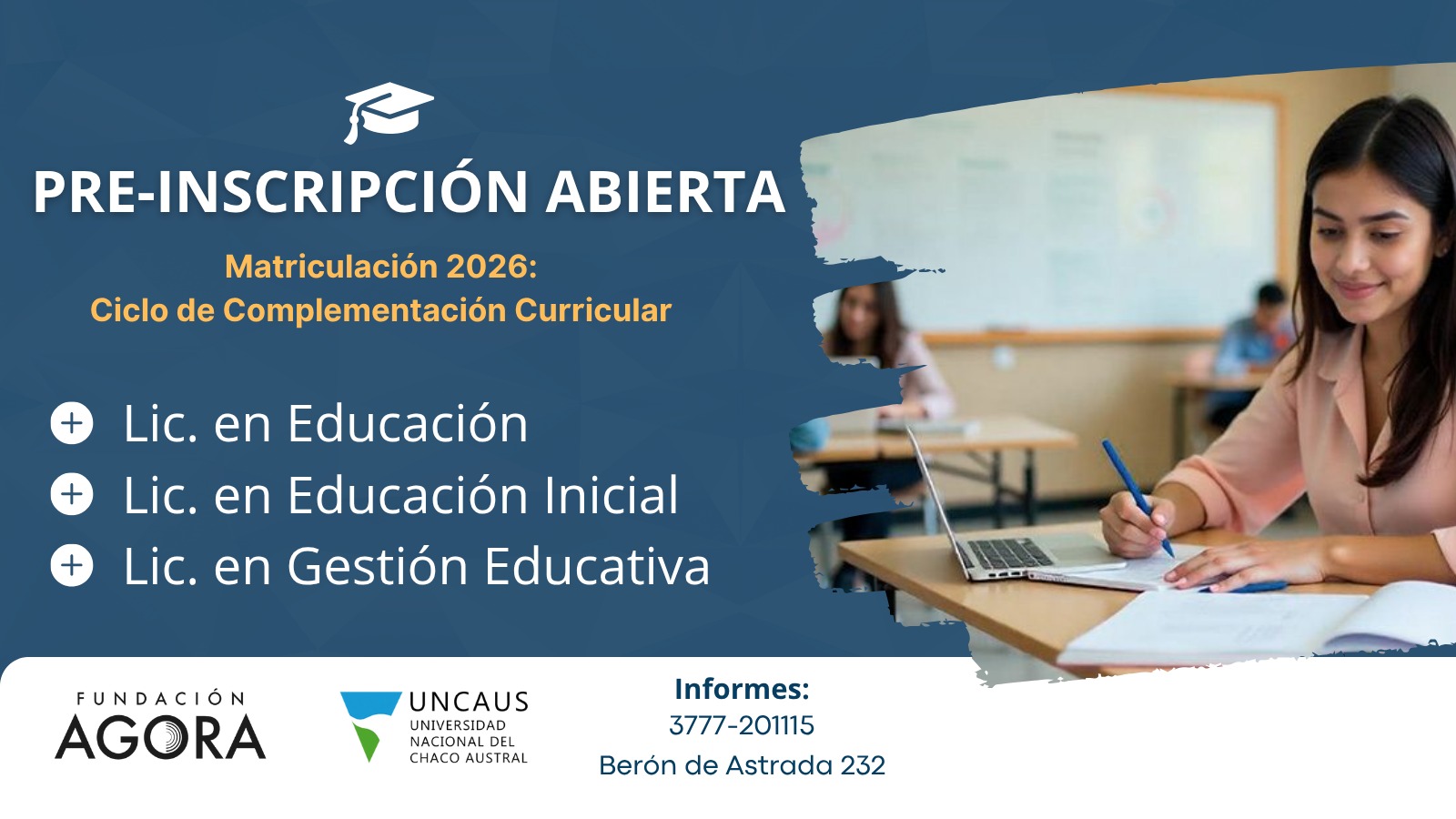 La Fundación Ágora informa que ya se encuentran abiertas las inscripciones para cursar, a partir del ciclo lectivo 2026, tres nuevas licenciaturas universitarias en convenio con la Universidad Nacional del Chaco Austral (UNCAus): Licenciatura en Educación Inicial, Licenciatura en Gestión Educativa, Licenciatura en Educación.