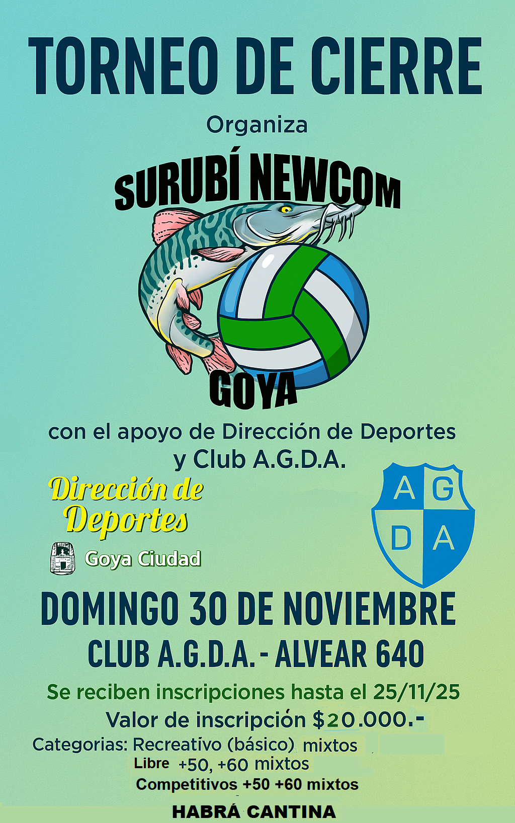 El próximo domingo 30 de noviembre, de 9 a 16 horas, en las instalaciones del Club A.G.D.A. serán sede de un Torneo Amistoso de Cierre de Newcom, organizado por el equipo Newcom Goya Surubí, dependiente de la Dirección de Deportes de la Municipalidad de Goya y Club A.G.D.A.