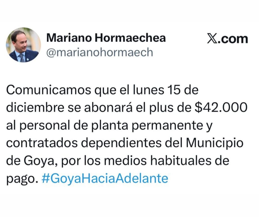 En su mensaje, el jefe comunal Hormaechea expresó: “Comunicamos que el lunes 15 de diciembre se abonará el plus de $42.000 al personal de Planta Permanente y Contratados dependientes del Municipio de Goya, por los medios habituales de pago. #GoyaHaciaAdelante”