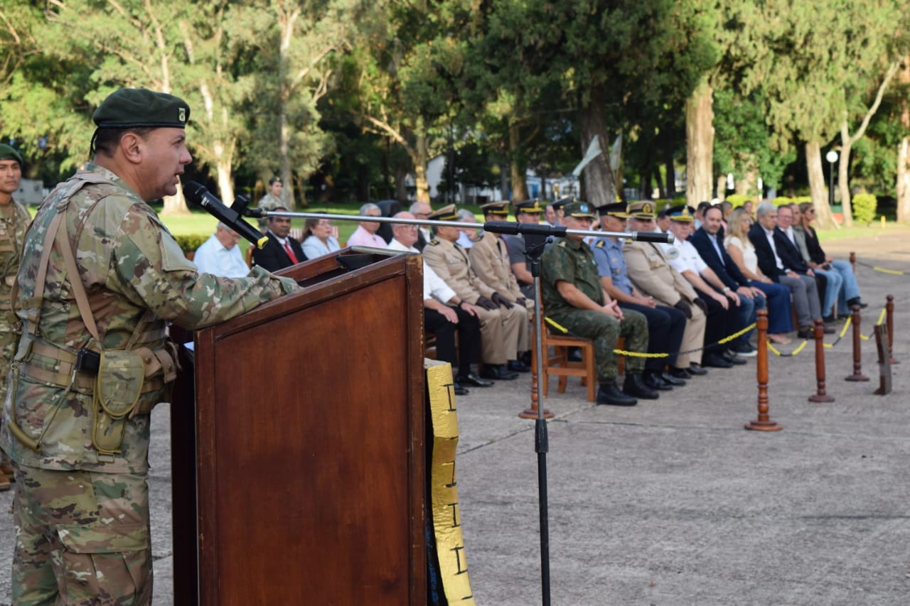 La ceremonia castrense finalizó con el pasaje de honor de la agrupación especial del Batallón de Ingeniero de Monte 12, acompañados de los sones de la Banda Militar “Puerto Argentino”.