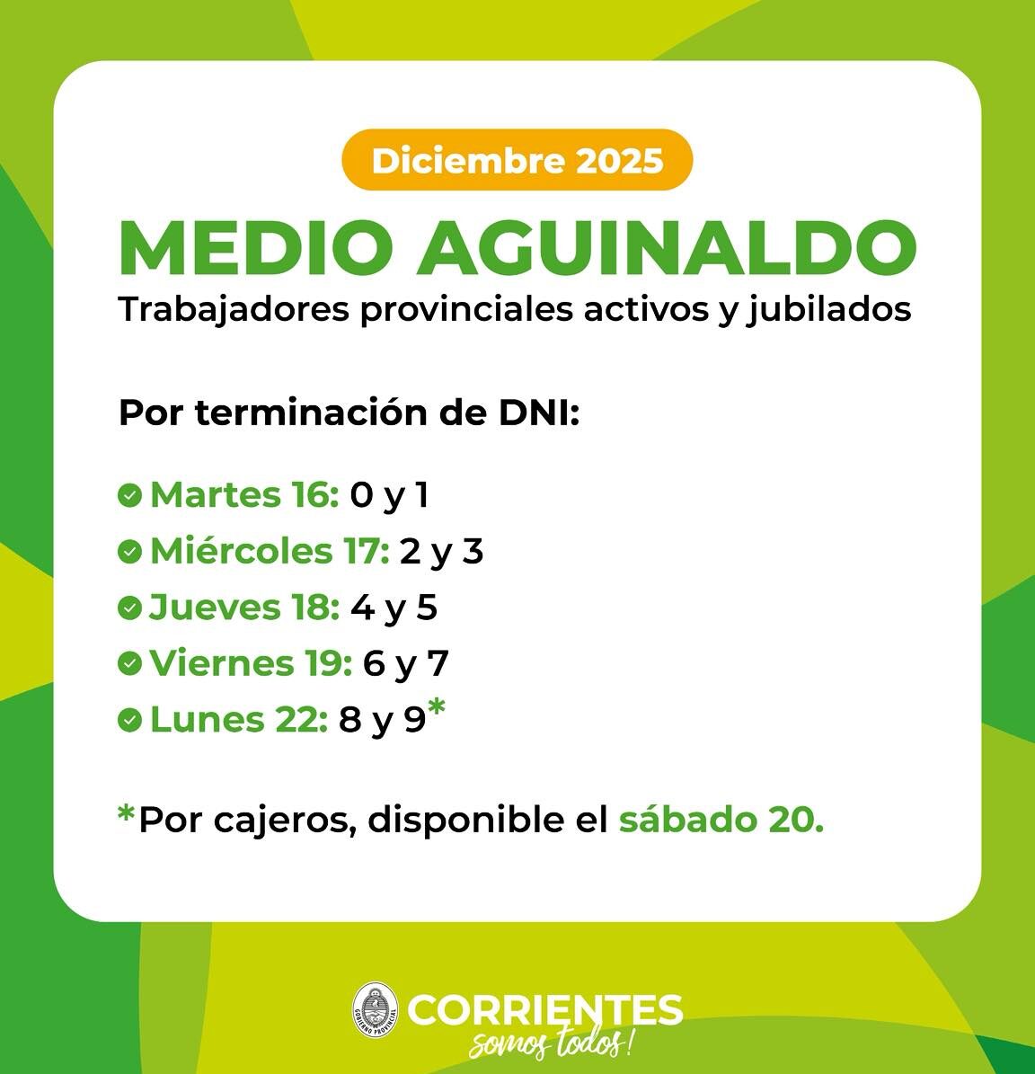 El Gobierno de la Provincia de Corrientes informó el cronograma de pago del medio aguinaldo correspondiente a diciembre de 2025 para trabajadores provinciales activos y jubilados, el cual se realizará de manera escalonada según la terminación del Documento Nacional de Identidad (DNI).