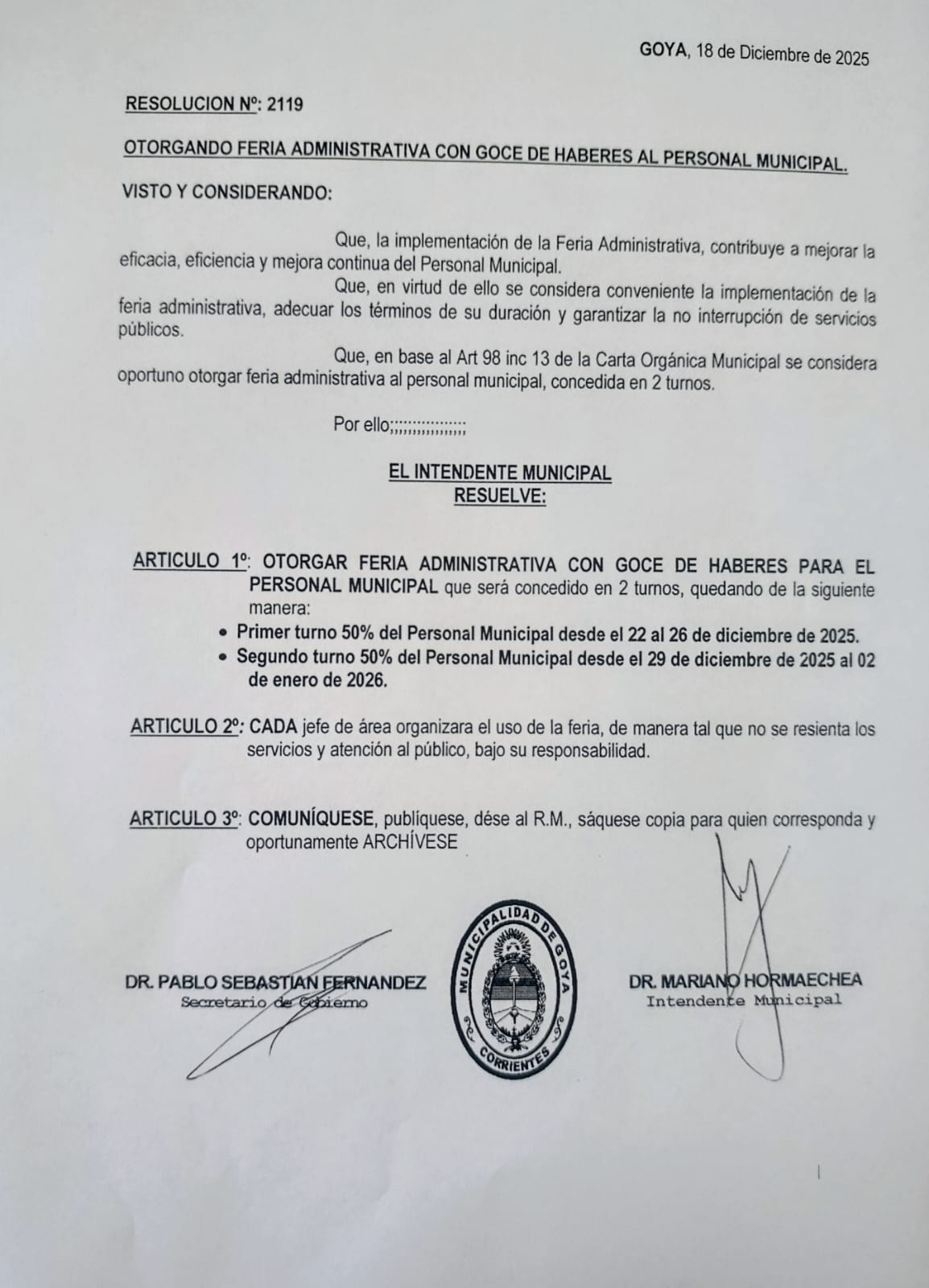 • Primer turno 50% del Personal Municipal desde el 22 al 26 de diciembre de 2025.