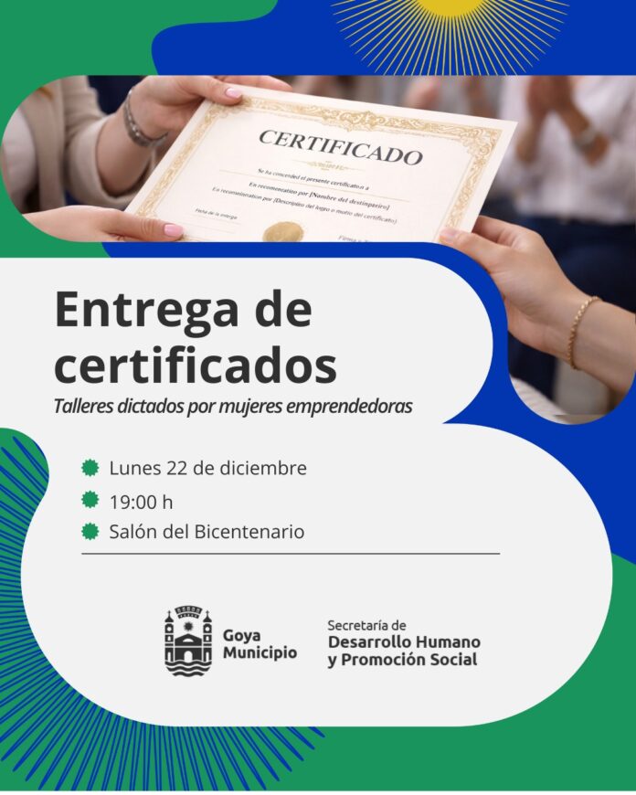 La Municipalidad de Goya, desde la Secretaría de Desarrollo Humano, a través de la Dirección de Promoción Social, invita al acto de entrega de los certificados de los diferentes talleres de oficios dictados por el grupo de “Mujeres Emprendedoras”.