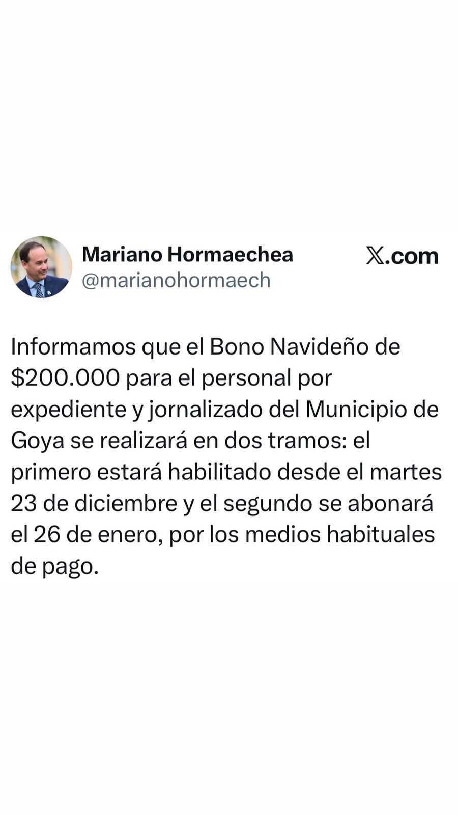 El intendente municipal doctor Mariano Hormaechea anunció en la mañana de este lunes para el personal por Expedientes y Jornalizados el Bono Navideño de 200.000 pesos en el que se efectivizará en dos tramos.