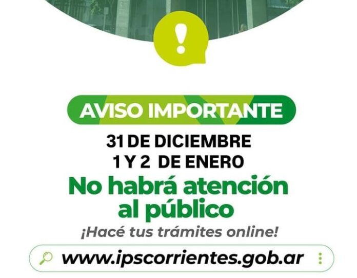 El Instituto de Previsión Social IPS informa a sus afiliados que el próximo 31 de diciembre, 1 y 2 de enero, con motivo del Asueto decretado por el Gobierno de la Provincia de Corrientes, la oficina del IPS CORRIENTES en Goya no atenderá al público.