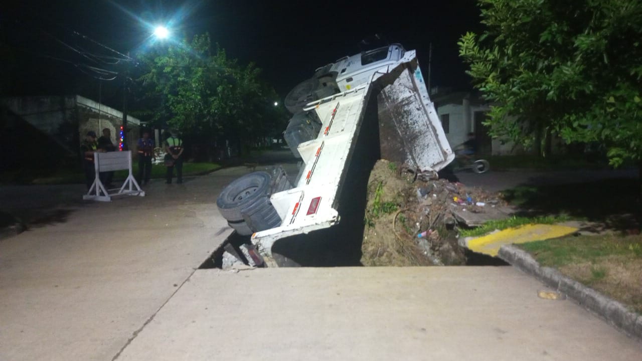 La situación se puso de manifiesto al momento del paso del camión municipal con carga por el sector, el cual cayó en el área afectada por el socavamiento.