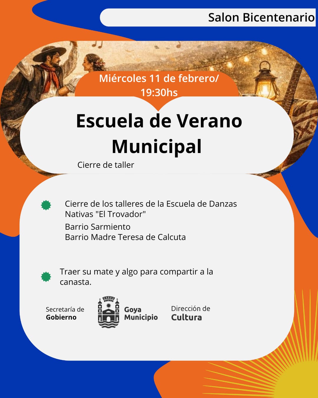 La Dirección de Cultura de Goya, a cargo de Manuel Zampar, anunció el cierre de los talleres de danzas nativas que se llevaron a cabo en los barrios Sarmiento y María Teresa de Calcuta, como parte del programa Escuela de Verano. El evento tendrá lugar este miércoles a las 19:30 horas en la Casa del Bicentenario.