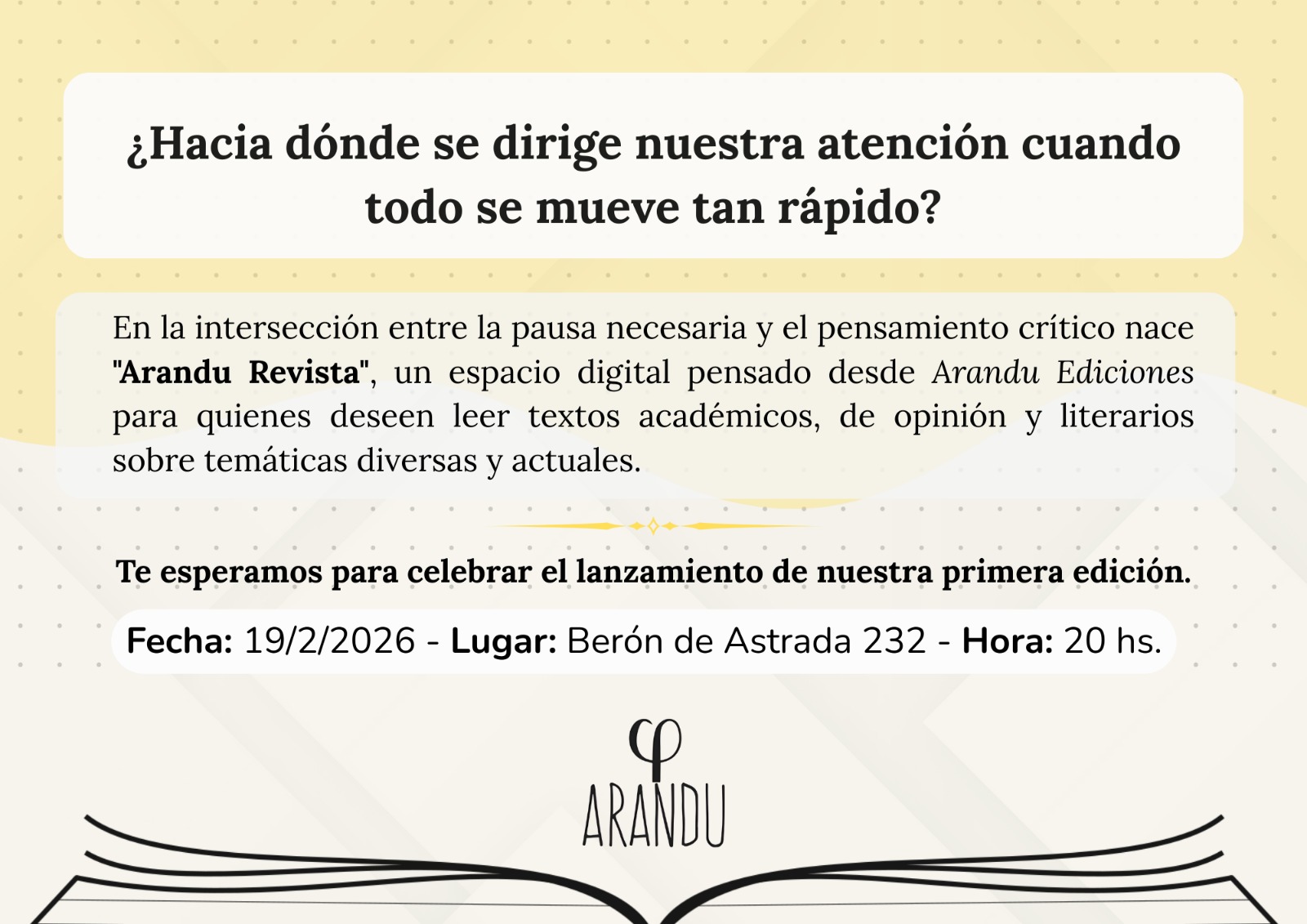 En un contexto donde la inmediatez marca el ritmo cotidiano y la información circula a gran velocidad, nace un nuevo espacio dedicado a la pausa y el pensamiento crítico. Se trata de “Arandu Revista”, una propuesta digital impulsada por Arandu Ediciones que será presentada oficialmente el próximo 19 de febrero de 2026 a las 20 horas, en Berón de Astrada 232.