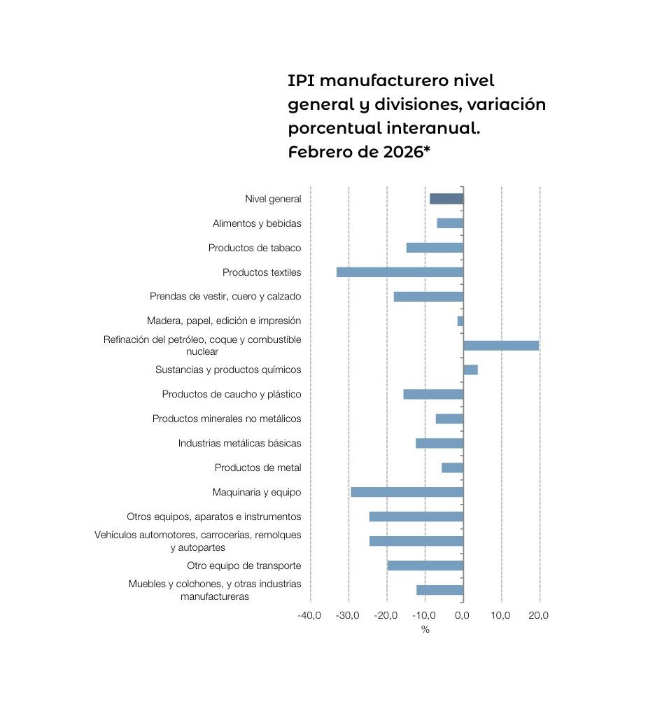 Dentro del esquema de las grandes categorías industriales, la caída más pronunciada se observó en el rubro de “Productos textiles”, que registró un desplome del 33,2% interanual en febrero. Le siguieron en magnitud de retroceso el bloque de “Maquinaria y equipo”, con una baja del 29,4%, y los sectores de “Otros equipos, aparatos e instrumentos” y “Vehículos automotores”, ambos con caídas del 24,6%.