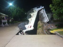 CAMION DE SERVICIOS SE HUNDIÓ POR ROTURA CAÑO DE RED CLOACAL